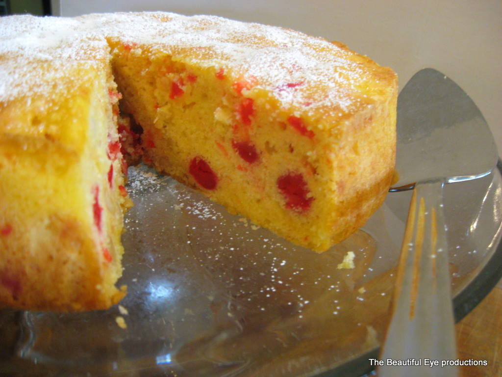 The most loved, most used  of all my many baking cookbooks is tattered, torn, mended and scribbled.  More than fifty years ago it came free with a bag of Robin Hood Flour.     I adore anything  baked with cherries.  This recipe for Cherry Almond Cake is literally bursting with big, bright cherries.  It makes a generous cake.  Wonderfully generous.  You can cut, slice and slice and nibble away to your hearts content.  It is a splendid cake for entertaining.  Large enough for second or even third slices.  What could be more perfect.